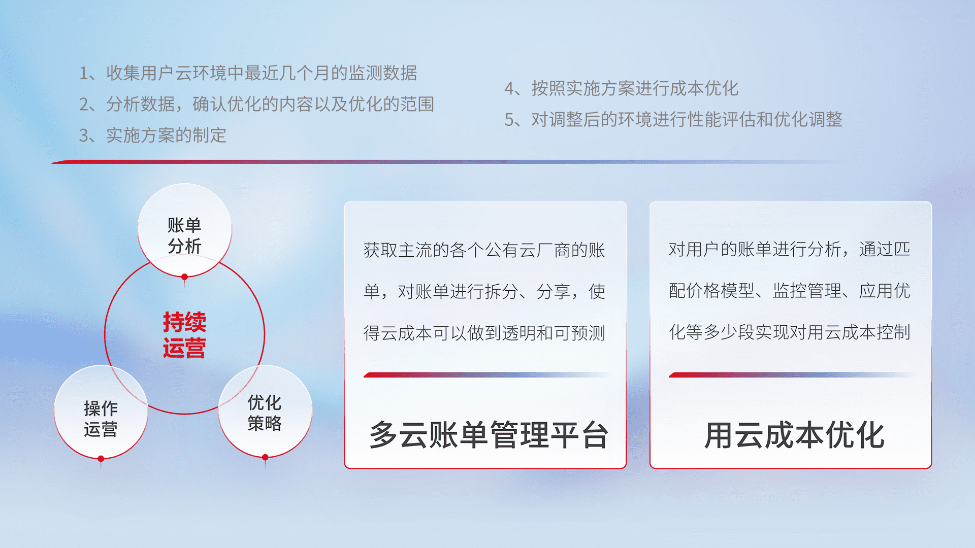 通过多云纳管,,以统一的资源数据模型把客户的云资源进行抽象和封装,,进而实现对多云资源的统一操作,,,,保障云资源管理的可靠性、、、、稳定性与可用性。。量身定制化运维内容,,配置、、、、开发运维、、、补丁管理、、、、备份、、、监控、、、、认证和访问管理、、、、审计和日常巡检等,,,保障在用云过程中的可靠度,,,,稳定度以及高可用率。。。。